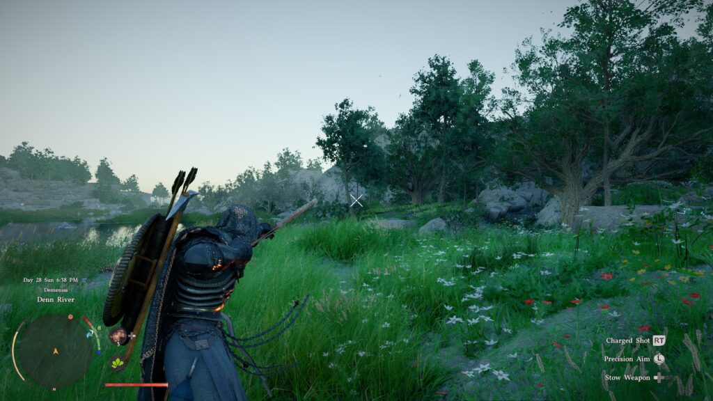 弓を構えると「あれ、どうやって戻るんだ?」と一瞬焦ることがあります。発売当初は回避行動しないと弓をしまえない無茶苦茶な仕様でしたが、現在は普通に操作で弓をしまえるようになっています(笑)