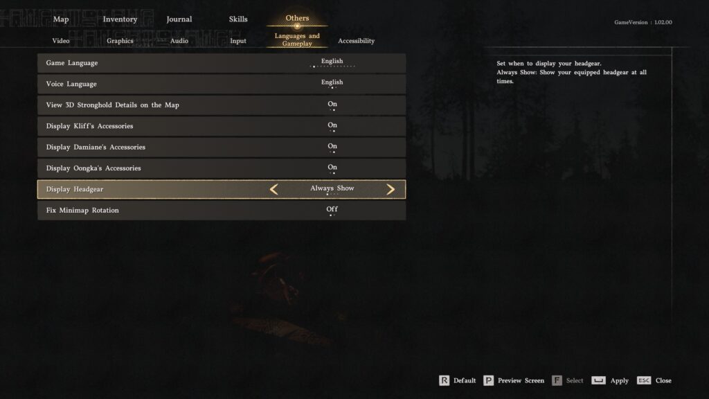 設定>言語とゲームプレイ>頭装備の表示からキャラクターの頭装備のオンとオフを選べるようになりました。