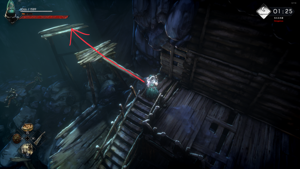 名もなき道は山岳エリア・鉱道エリア・監獄エリアと3部構成になっており長い。まずは坑道エリアに向かうため、小屋からひたすら山岳エリアを上に向かって進んでいく。