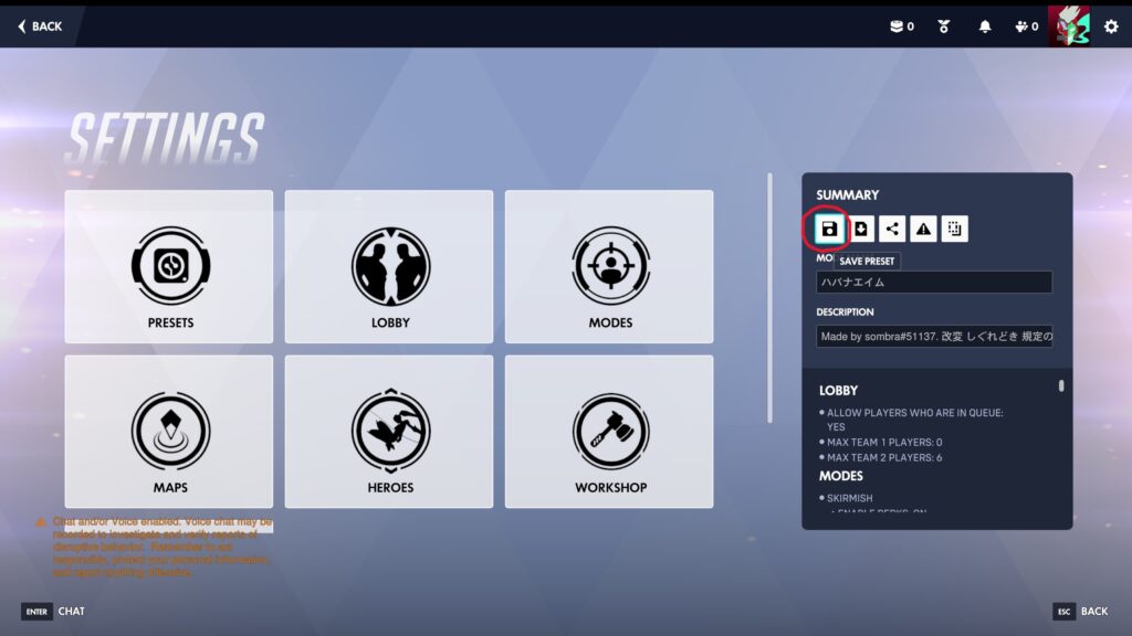 カスタムゲームの設定は、オーバーウォッチのアカウントに紐づいて保存されます。一度保存しておけば、同じアカウントでログインしている限り、別の日に起動してもプリセット一覧から呼び出すことが可能です。