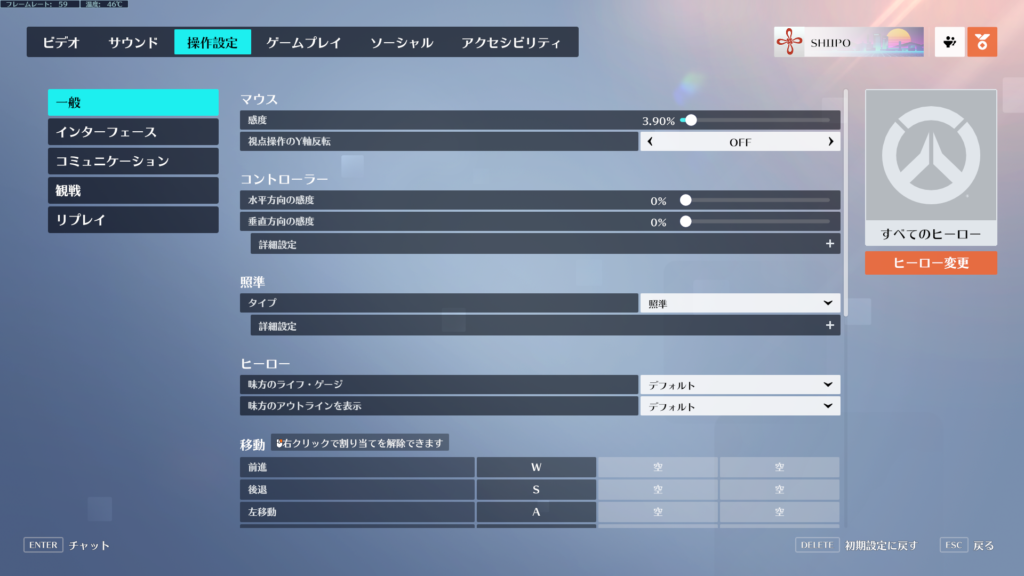 エイムの精度を上げるのに重要な「感度」や「操作」するキーを変更できます。「オーバーウォッチ」の設定でも特に重要な要素ですが、個人によって最適な数値が違うため、自分で色々試しながら調整することをオススメします。