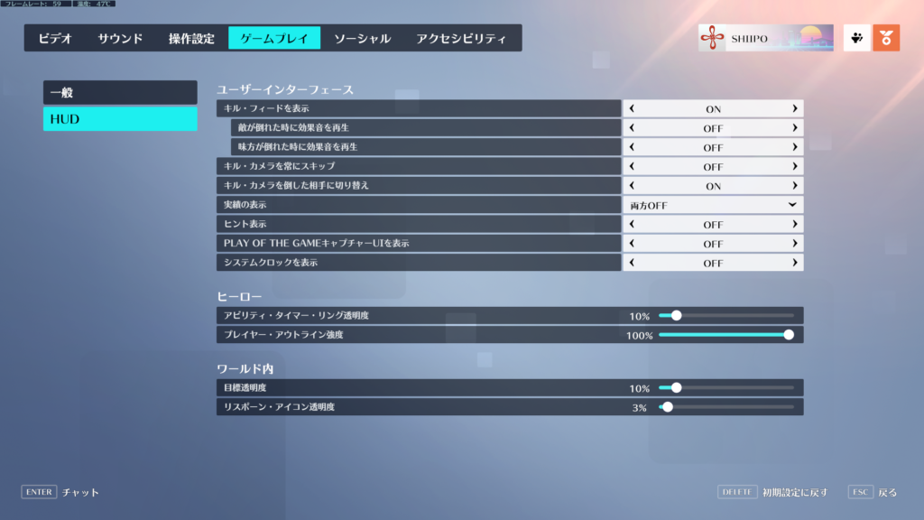 ゲームプレイ項目内では、主にマウスの高精度入力の切り替えや、HUDの透明度を変更することができます。ゲームプレイに大きな影響を与える物は少ないものの、変更することで戦いやすくなる項目が幾つかあるので紹介していきます。