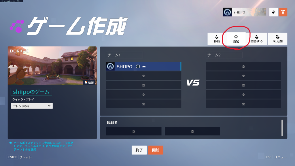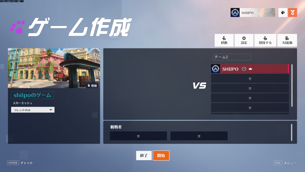 設定画面からゲーム作成へ戻り「開始」を押す