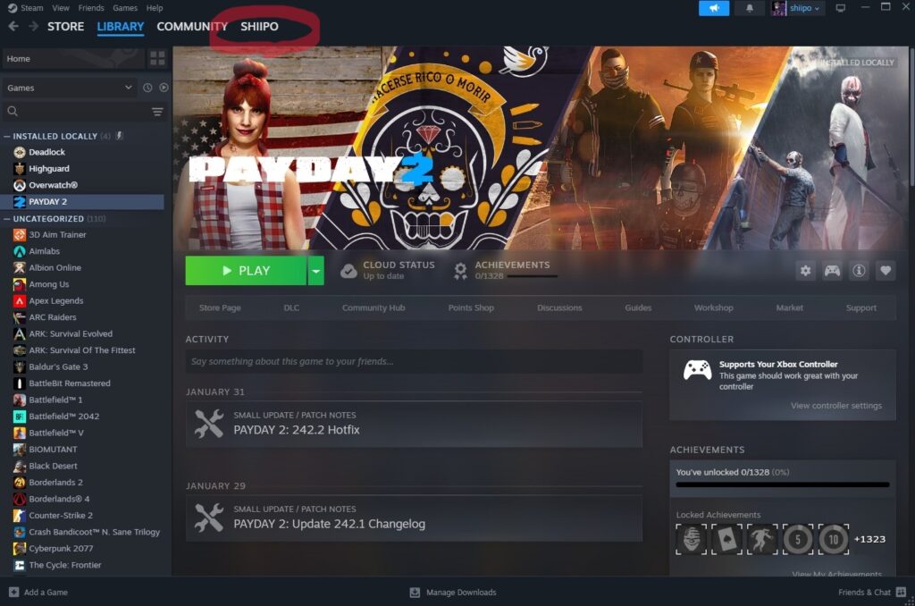 Steamランチャー上部の「アカウント」名をクリックすることでも、同様に自分のフレンドコードを調べらます。